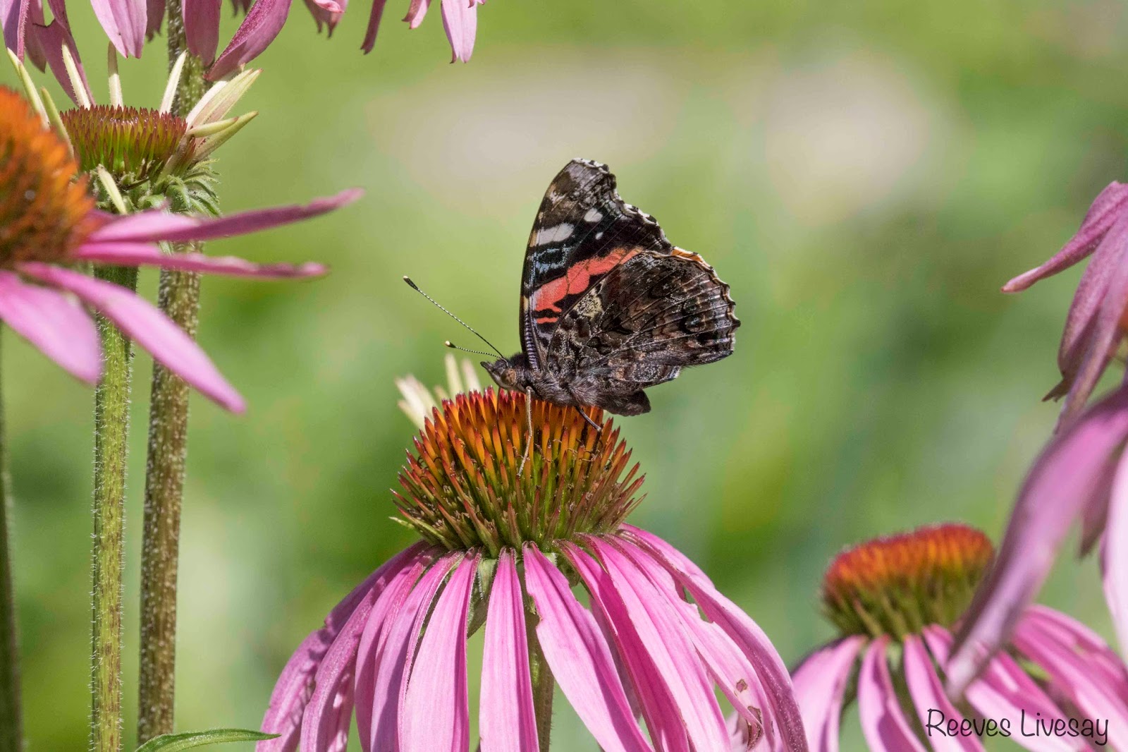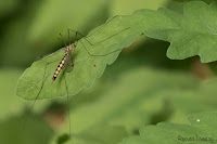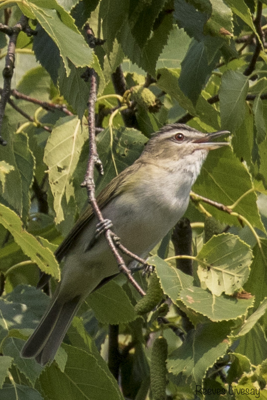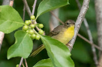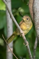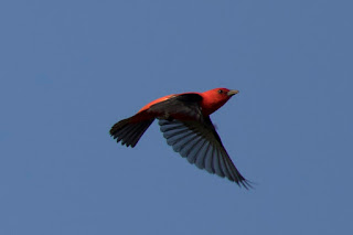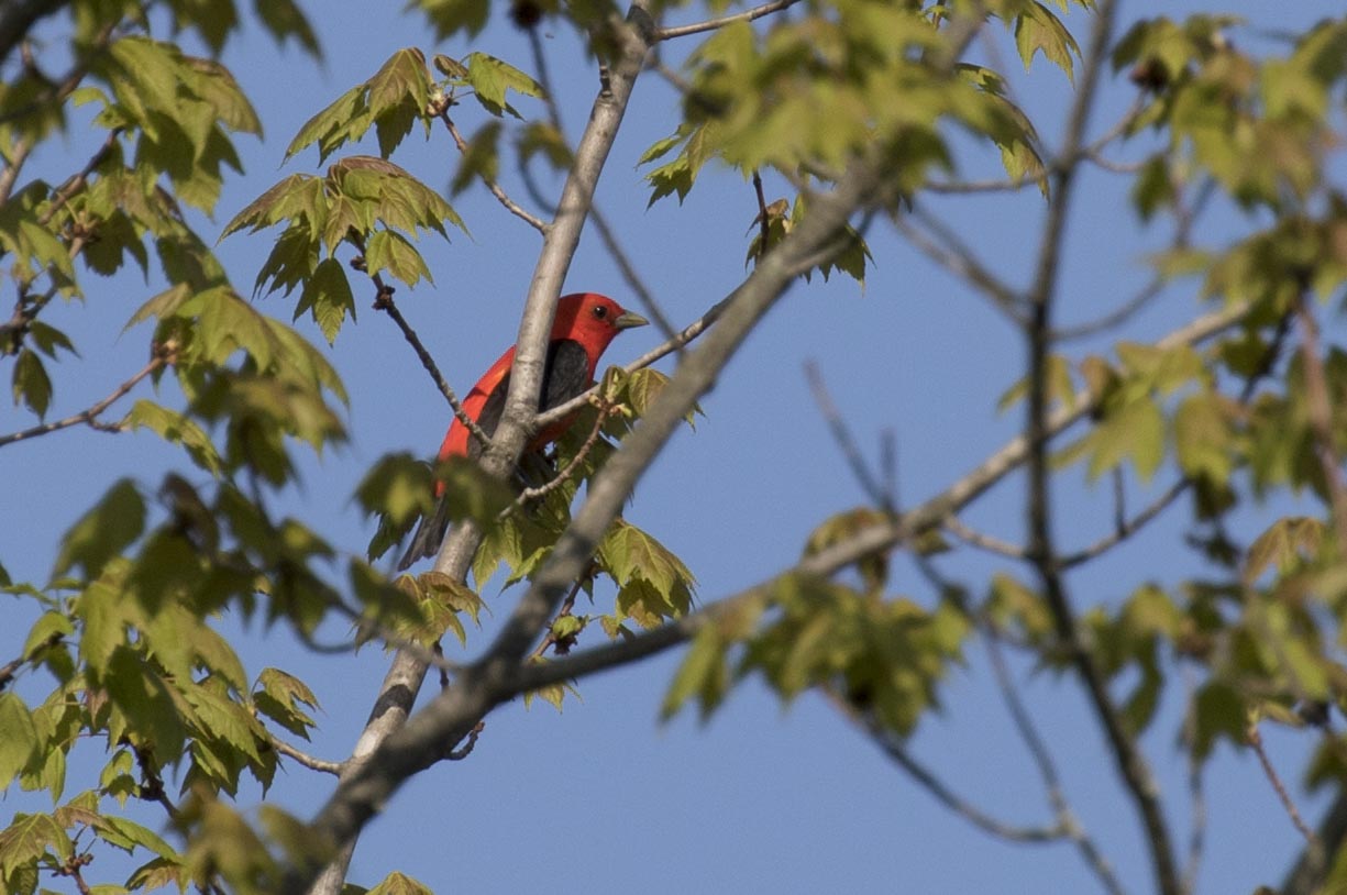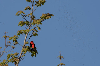 We spotted a Scarlet Tanager skipping from treetop to treetop off the east side of the house. He seemed very disinterested in the swarm of newly hatched flies next to him (seen in the photo below).